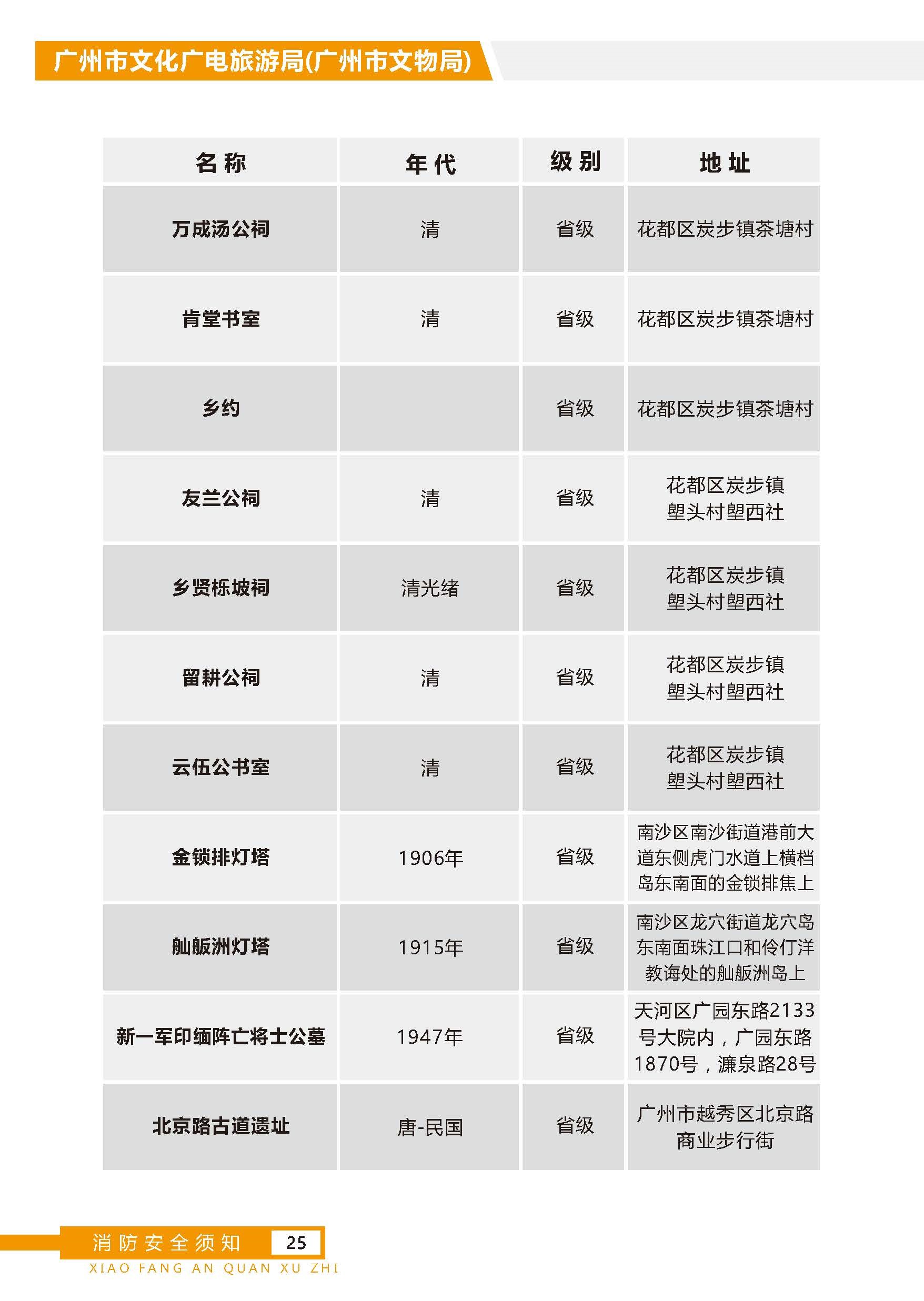 为进一步落实文物古建筑、博物馆火灾防控措施,响应国家文物局部署开展的全国文物火灾隐患整治和消防能力提升行动实施方案,广州市文化广电旅游局文物管理处(文化遗产管理处)的同志近日带队前往全市重点文物保护单位开展文物建筑消防安全检查工作及文物建筑消防安全宣传活动。